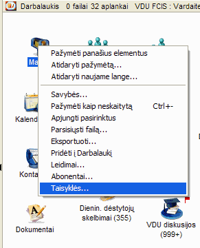 FirstClass Darbalaukio lange esančių ikonų dydį galima pasirinkti kokį norite. Tuo tikslu reikia vykdyti komandą Vaizdas (View) / Mastelio ikonų vaizdas (View by Scaled Icons) ir toliau komanda Vaizdas (View) / Kesti vaizdo savybes (Change View Properties) lange Ikonos (Icons) pasirinkti norimą dydį Dydis (Icon size) tempiant pele žymeklį ant linijos, po to paspausti Taikyti (Apply) ir Gerai (OK):