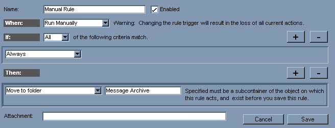 Use this mail rule to move messages from your Mailbox to an existing Mailbox folder on demand. Select the messages you want move, then choose Message > Run Manual Rules.