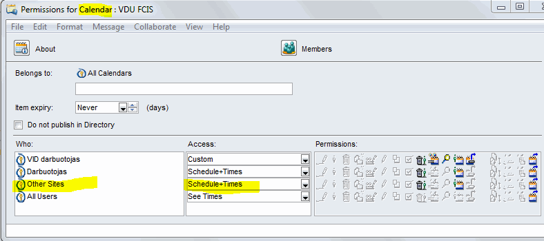 a) jei Jūs savo FirstClass kalendoriuje esate nurodę teises, kad kiti galėtų įrašyti Jus kaip dalyvius, t.y. Other Sites - teisė Schedule...,