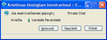 Lange Tiesioginis bendravimas paspauskite pele Iškviesti (Invite) ir du kartus spustelėkite pele ant pavardės su kuo norite kalbėtis. Kviečiamas asmuo ekrane išvys tokį langą:
