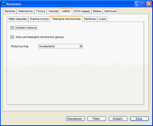 Jeigu nenorite, kad kiti FirstClass vartotojai turėtų galimybę Jus kviesti pokalbiui realiame laike, galite nustatyti, kad kiti negalėtų kreiptis - pasirinkite meniu komandą Redagavimas (Edit) / Nuostatos (Preferences) / Laiškai (Messaging) / Tiesioginis bendravimas (Instant Messaging) ir pažymėkite "varnele" opciją Atmesti kvietimus (Refuse invitations) bei paspauskite Gerai (OK):
