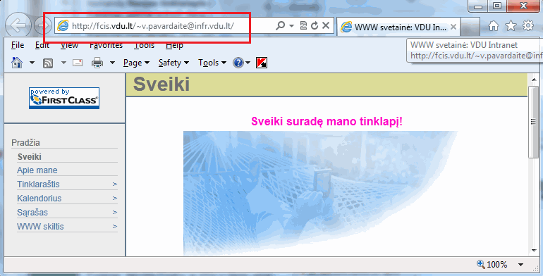 Įvykdžius šią komandą automatiškai atsidarys interneto naršyklės langas (Internet Explorer, Mozilla Firefox ar kita) ir lango adreso eilutėje matysite kokiu adresu Jūsų puslapį internete galės pasiekti kiti internautai: