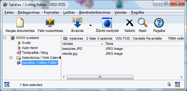 Komandos Naujas tinklalapis šablonas Sąrašas/ Listing Folder skirtas jame talpinti įvairius failus. Jūsų puslapio lankytojai gali tuos failus atsisiųsti. Failas į Sąrašą/Listing folder įkeliams komanda Failo nusiuntimas (Upload) (meniu punkto, failo pavadinimą galima pakeisti kontekstinio meniu komanda Savybės (Properties)):