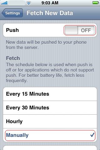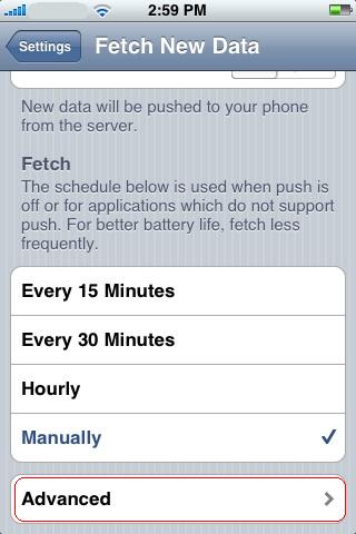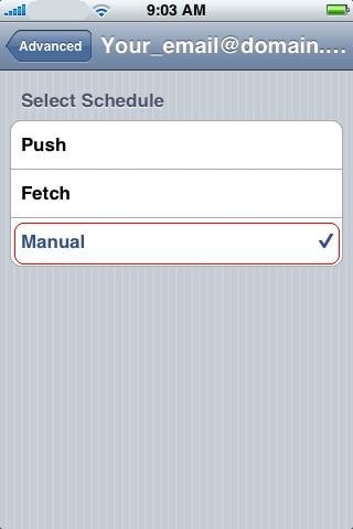13. Nustatykite Push į OFF, ir Fetch tvarkaraštį į Manually. |