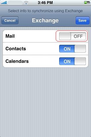 8. Išjunkite Mail pasirinkimą. Taip pat galite išjungti Contacts arba Calendars, jei nenorite kažkurio iš jų sinchronizuoti. Spauskite Save. |