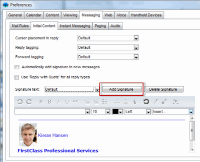 The FirstClass Client now supports multiple signatures. Users can create new signatures on the messaging tab within the user preferences area.