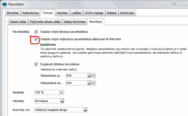 Tačiau kiekvienas vartotojas gali pats nusistatyti (jei yra užtikrintas savo kompiuterio antvirusine apsauga), kad tokius paveikslėlius rodytų visada: Redagavimas / Nuostatos / Turinys / Parinktys
