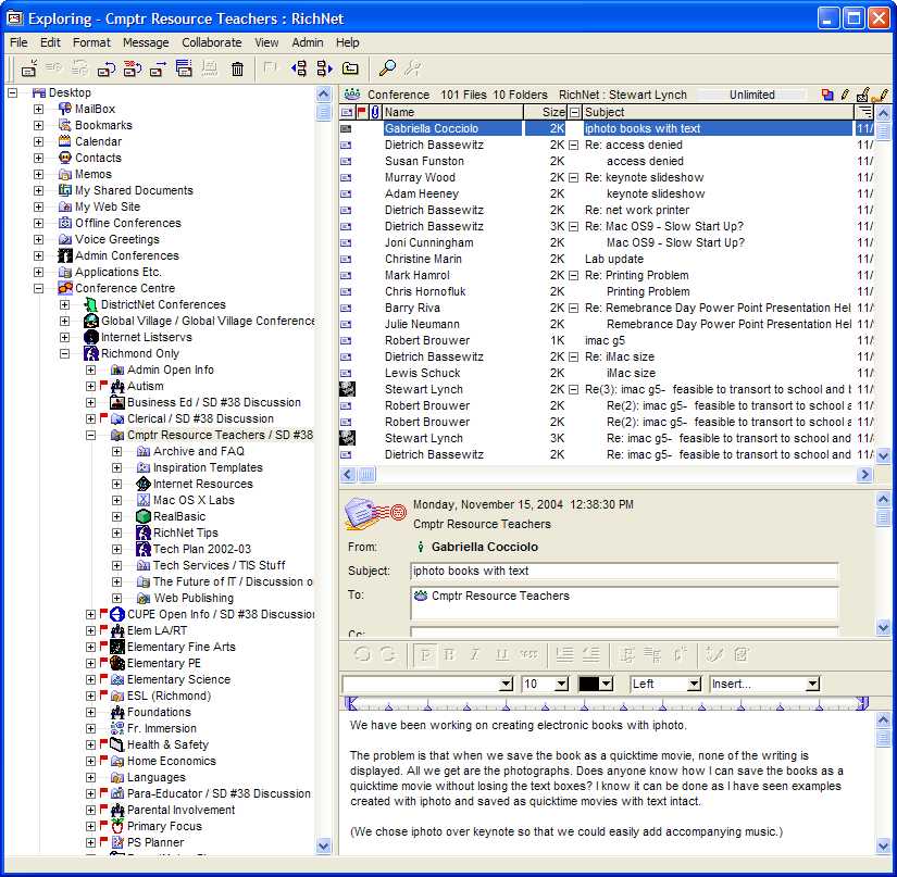 We do very little FirstClass client training because it is really very intuitive. What we do mostly is hold sessions that point out some of the more subtle features of the Client. I am doing a session in our school district this week and have put together a document that I will be providing our users. I thought that some of you might be interested in this so feel free to copy, revise and reuse. Some of the content here is more specific to what we do and how we have set our system up but the majority of the content is pretty generic. Some I have borrowed from what Julie Oke has done.