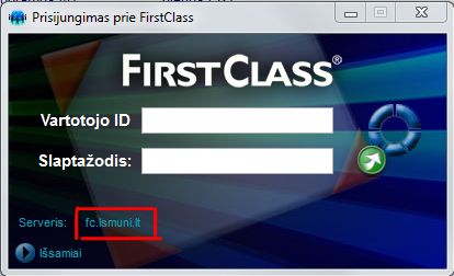 Startuokite FirstClass kliento programą ir monitoriuje matysite Prisijungimo (Login) langą: