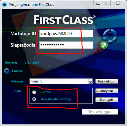 Jei esate registruotas FirstClass vartotojas pažymėkite Registruotu vartotoju (Registered user) ir į laukelį Vartotojo ID (User ID) įveskite savo prisijungimo vardą, o į laukelį Slaptažodis (Password) – savo slaptažodį ir paspauskite Prisijungti (žalia rodyklėlė ).