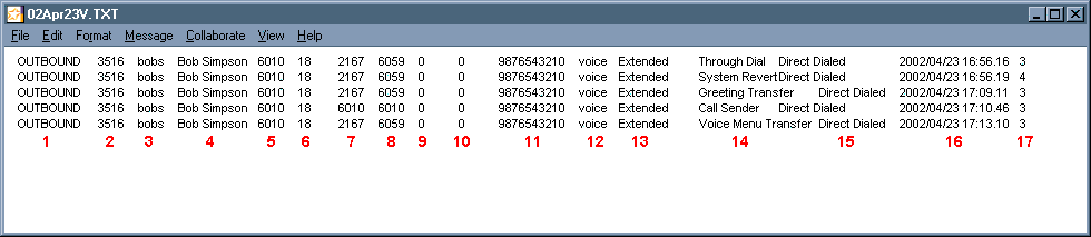 17 The duration of the call. This value cannot be tracked for configurations involving Brooktrout TR114 analog voice cards.