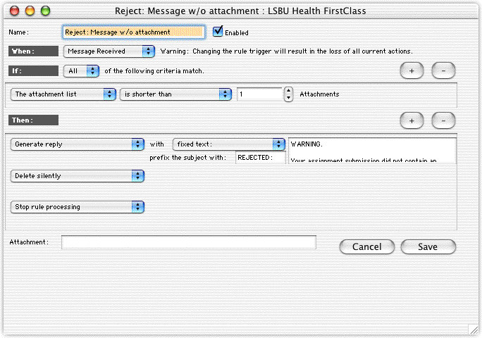 This rule checks to see if the number of message attachments is less than 1. If this condition is true (no attachment), the rule sends this rejection reply: