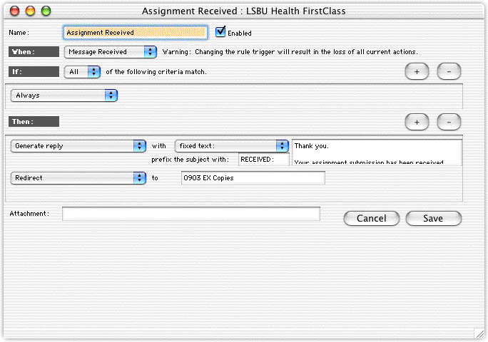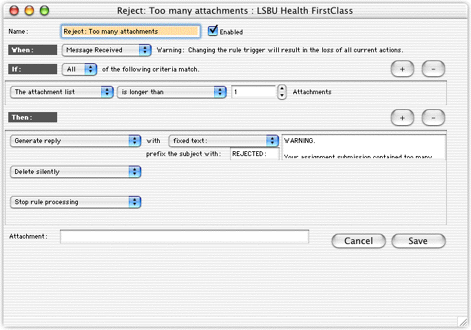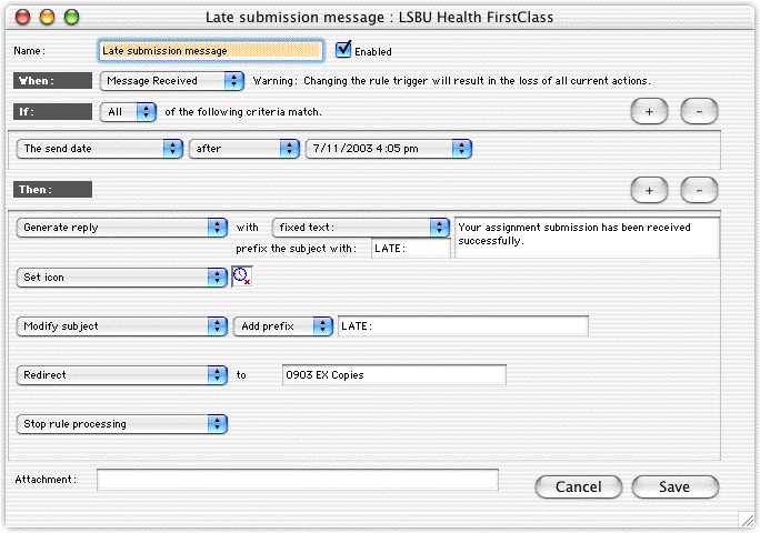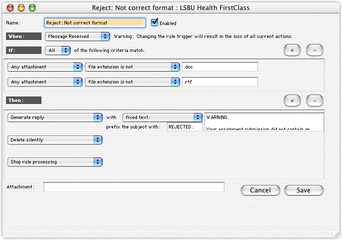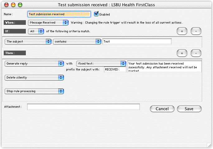 The message is then deleted silently and the rules processing is stopped. As long as the students receive an appropriate reply, they are happy, so it is unnecessary to actually keep the test submissions.