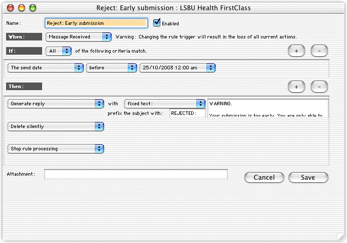 This rule checks the date of the submission and, if it is too early (the submission period is two weeks prior to the submission date), sends this rejection reply: