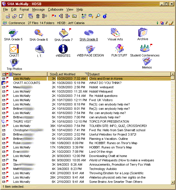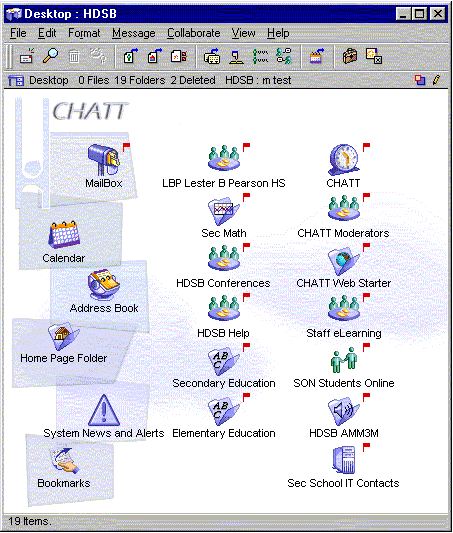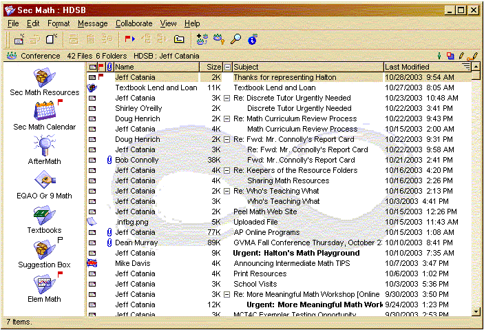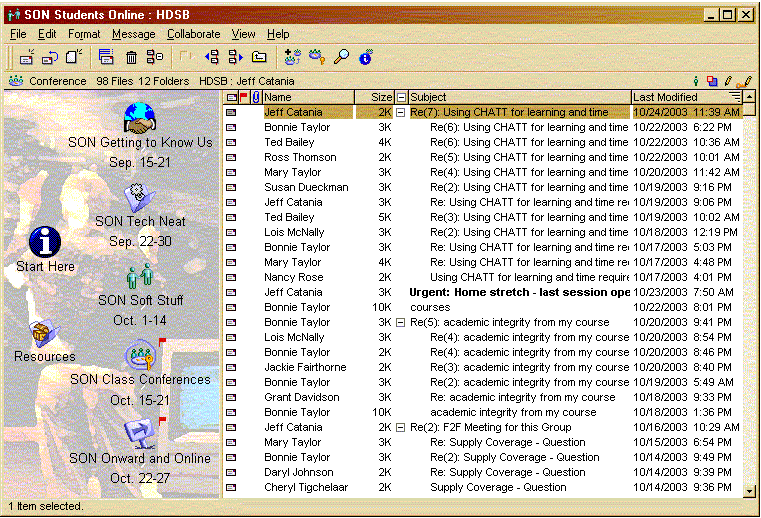 HDSB now uses FirstClass conferences in the classroom, between teachers, between school administration, and between teachers and administration. They now have what they call "families" of conferences, including 87 active school conferences, administrative conferences, student conferences, committees, and so on.